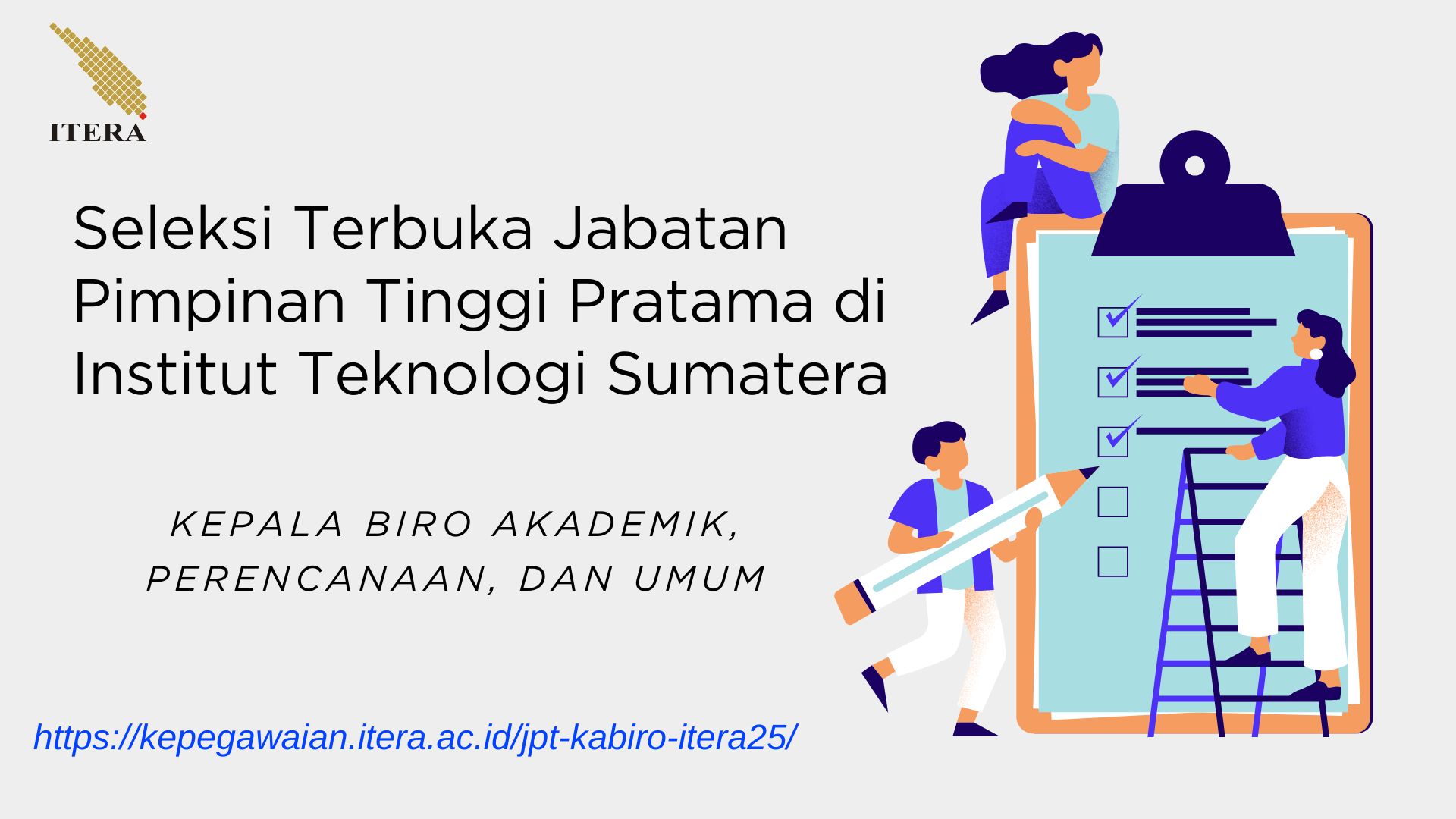 Panitia Seleksi Jabatan Pimpinan Tinggi (JPT) Pratama Institut Teknologi Sumatera (ITERA) membuka kesempatan bagi Pegawai Negeri Sipil yang memenuhi syarat untuk mengikuti Seleksi Terbuka JPT Pratama Kepala Biro Akademik, Perencanaan, dan Umum ITERA. Seleksi ini dilaksanakan secara transparan sesuai ketentuan peraturan perundang-undangan yang memiliki integritas, kompetensi, serta rekam jejak yang baik.